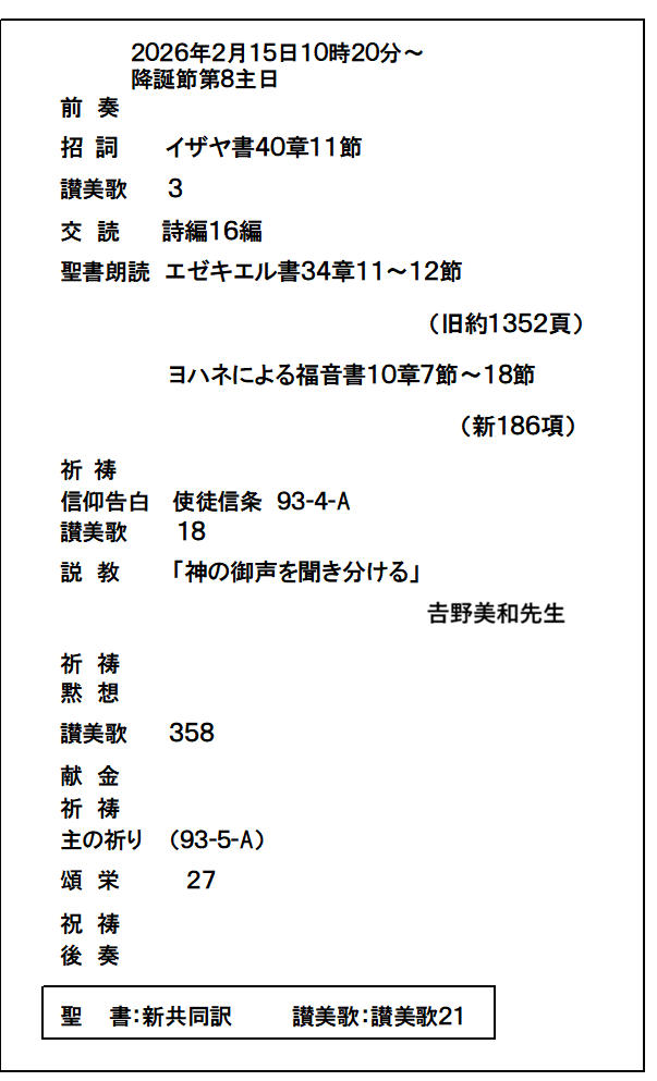 2.礼拝は前奏から始まります(5分前に着席を心がけ、静かに礼拝に備えましょう)。