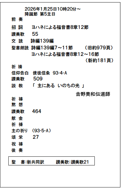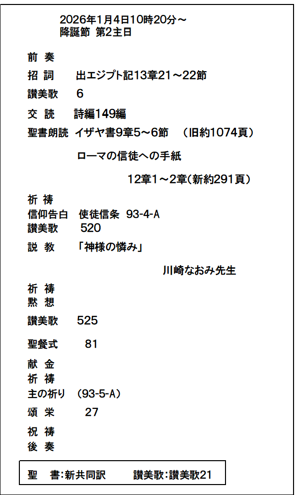| 日曜 | 主日礼拝 午前10:20~ |